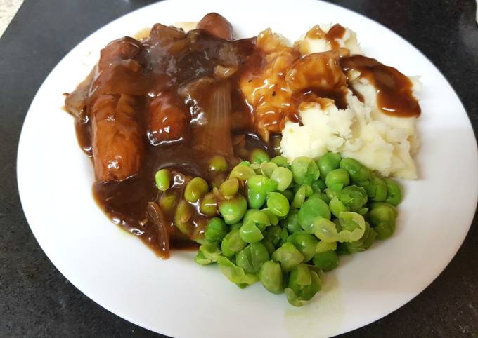 - When you put the sausage and onion back in the oven to finish. Peel potatoes and boil to make mashed potato to go with the sausage and onion gravy. Also peas..